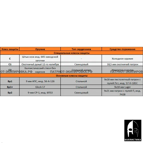 • «Стандарт (С2, Бр1)» – непробитие 50% стальными шариками 6,35 мм на скорости ⩾ 615,5 м/с (имитация осколков).